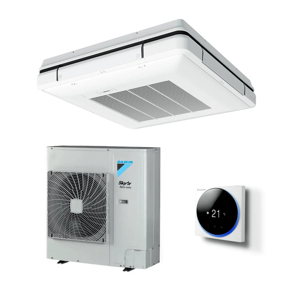 Aparat de aer condiționat tip casetă pentru plafon Daikin SkyAir Alpha-series FUA100A-RZAG100NY1, Inverter 32.000 BTU, cu telecomandă inclusă, eficiență energetică superioară și distribuție uniformă a aerului.
