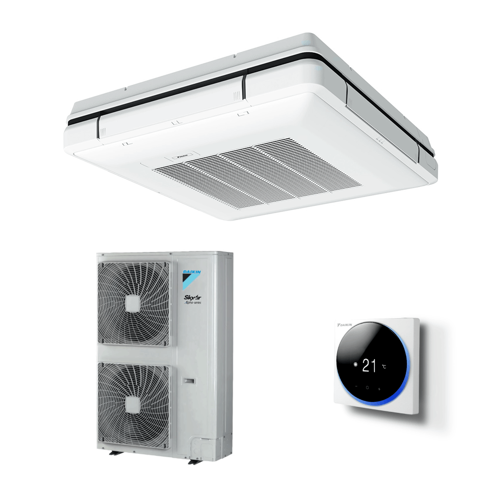 Aparat de aer condiționat tip casetă Daikin SkyAir Alpha-series Bluevolution 45000 BTU Inverter, cu panel și telecomandă incluse. Eficiență ridicată, control confortabil și design elegant, perfect pentru spații comerciale și birouri.